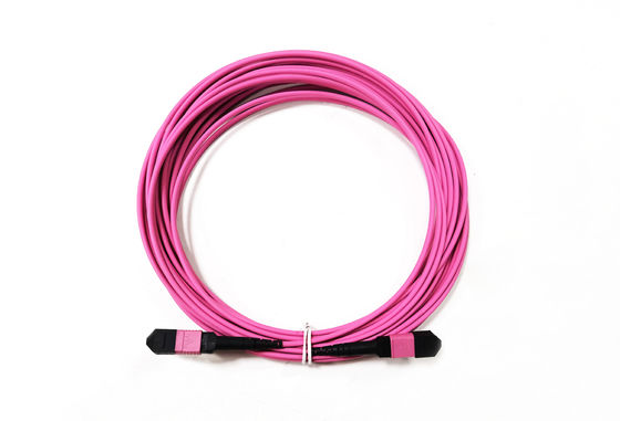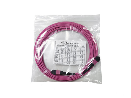 12 สายไฟเบอร์ MPO สายเชื่อมเพศหญิง ปาทช์คอร์ด OM4 50/125um ความสูญเสีย Elite 0.35dB Polarity A สีม่วง