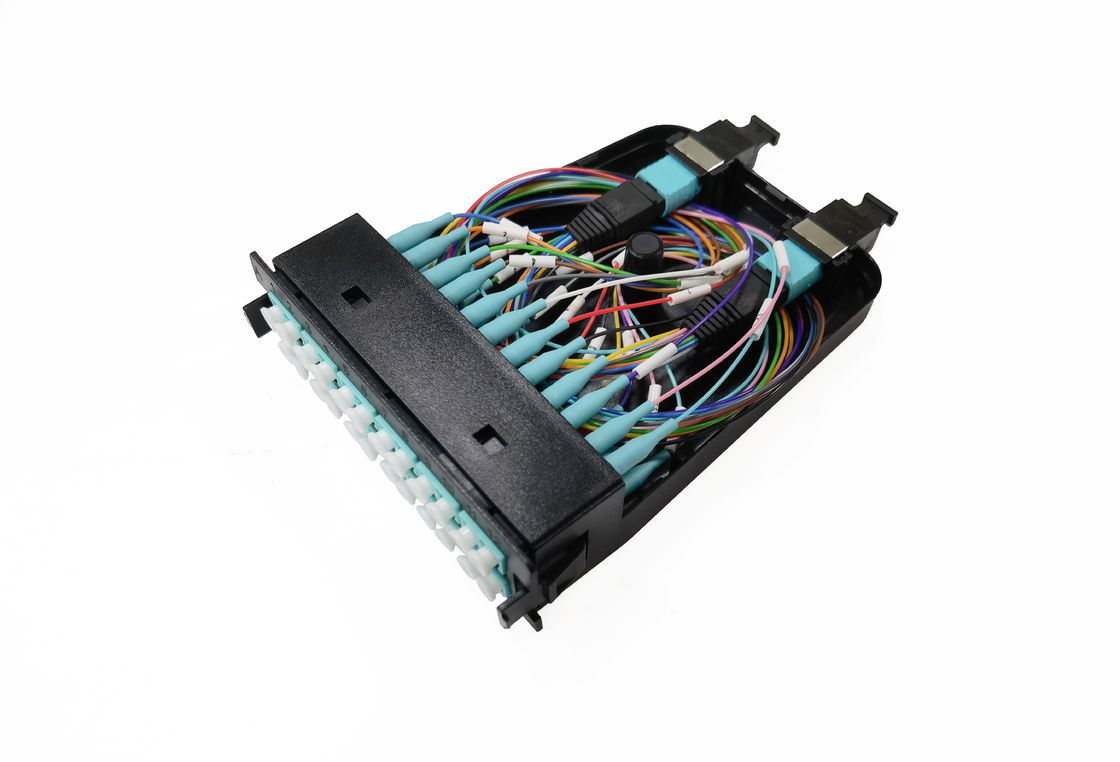 12 24 เส้นใย MTP MPO Fibra Optica Modular Cassette พลาสติก OM3 10G Aqua Male Guide Pin